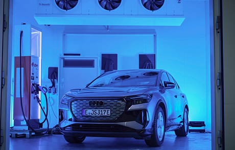 Am Standort in Essen werden E.ON-Ladelösungen für Elektrofahrzeuge erforscht und getestet, einschließlich deren intelligente Einbindung in das Energie-Ökosystem. Das Testlabor bietet nicht nur umfangreiche Prüfstationen für Fahrzeuge, Ladestationen, Wallboxen und Zubehör, sondern auch fünf spezielle Klimakammern. Diese ermöglichen Ingenieuren, weltweit auftretende Temperaturbedingungen von eisiger Kälte bis zu extremer Hitze zu simulieren und das Ladeverhalten von Elektroautos bei Temperaturen zwischen minus 40 und plus 50 Grad Celsius zu untersuchen.