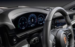 Der Fahrer profitiert jetzt von einem 12,6 Zoll großen freistehenden Curved Display. Dieses bietet je nach Ausstattung bis zu sieben Ansichten und stellt Informationen wie den Drehzahlmesser, Online-Navigation, Nachtsichtassistent oder die 3D-Fahrassistenz in den Vordergrund. Auch werden die Puristen unter den Porsche-Fahrern berücksichtigt: Ein minimalistischer Classic-Modus steht zur Auswahl, die die altbekannte Fünf-Tuben Ansicht aus der analogen Welt zurückbringt.
